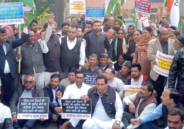 Chandigarh Territorial Congress Committee today organised a massive protest against Adani Group and Modi led Bjp government in front of SBI head office in sector 17 chandigarh. The protest was led by H s Lucky President Chandigarh Congress. The protestors carrying placards and banners raised slogans against crony capitalism, bending of rules and regulations only to benefit selected corporate friends of the Modi Government and forceful investment in the Adani Group by government bodies.